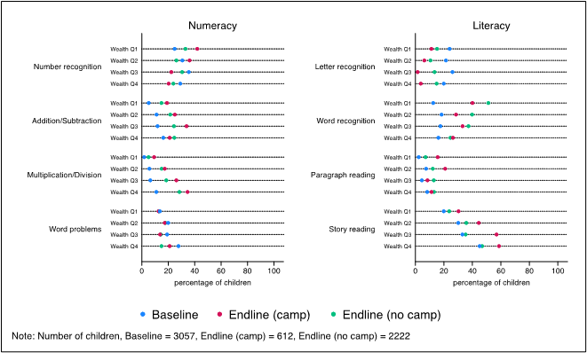 - By endline, children from the highest wealth quartile remained more likely to reach advanced literacy and numeracy levels, particularly story reading and comprehension.