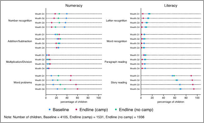 At baseline, disparities by household wealth were evident, with children from wealthier households starting at higher literacy and numeracy levels.